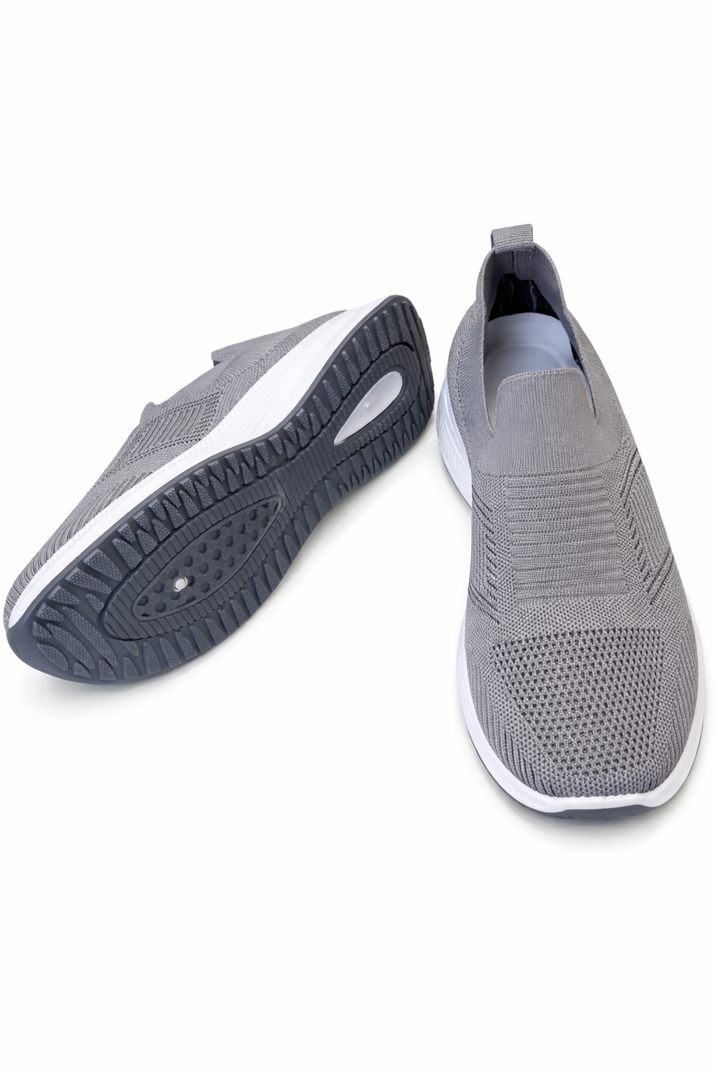 Made from premium breathable knit fabric, these sneakers feature grey accent stripes and a stretch-fit slip-on design for easy wear.